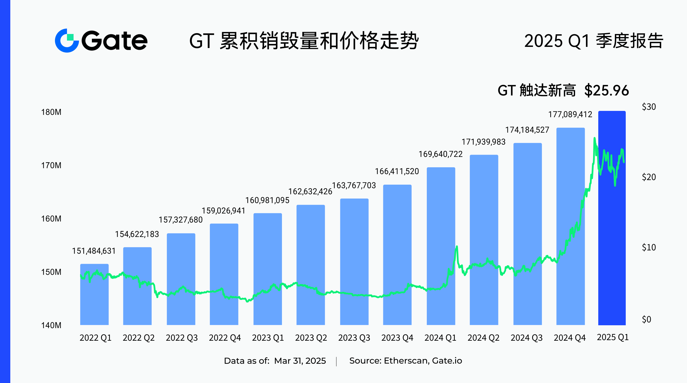 自 GateChain 于 2019 年上线以来,GT 一直执行销毁机制,使得代币总量从最初的 3 亿枚缩减约 60%。截至目前,GT 累计销毁数量已达 177,089,412.23 枚,销毁价值约 408,270,578 美元。即使在市场环境波动的情况下,GT 的销毁政策依然稳定执行,这不仅体现了Gate 对 GT 通缩的承诺和坚持,也为 GT 的长期价值提供了有力支撑。