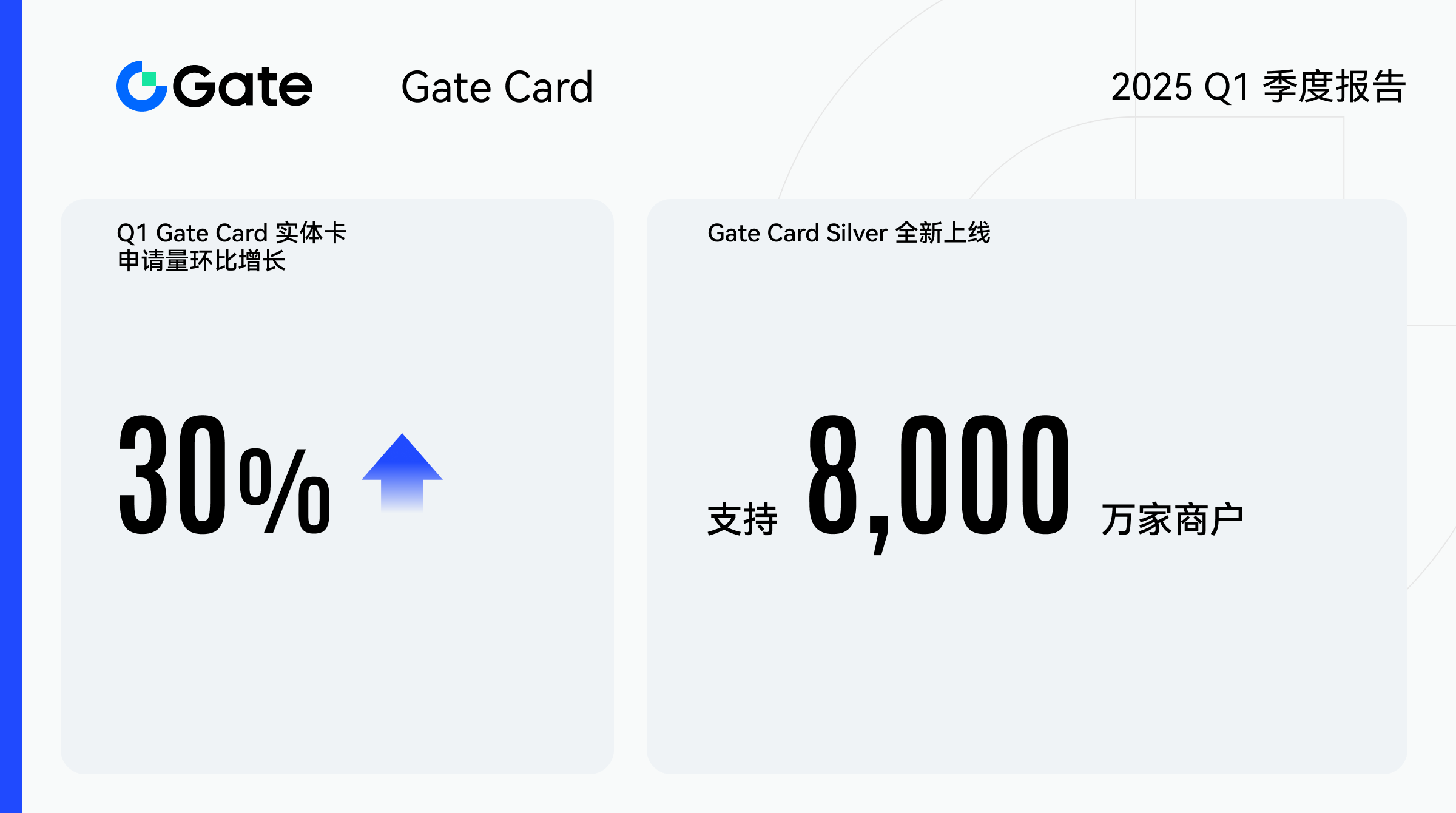 Gate Card 直接绑定用户的 Gate 账户,既不同于传统借记卡或信用卡,也不充当金融中介。本季度,Gate Card 实体卡申请量较 2024 年第四季度增长了 30%,这主要得益于 Gate Group 在全球加密支付领域的深耕拓展。Gate Group 于本季度推出 Gate Card Silver 虚拟卡,该万事达卡支持使用 BTC、ETH、USDT 等加密货币在全球 8,000 万家商户以本地货币结算,旨在优化用户的资产管理体验,提供更便捷的全球支付解决方案。