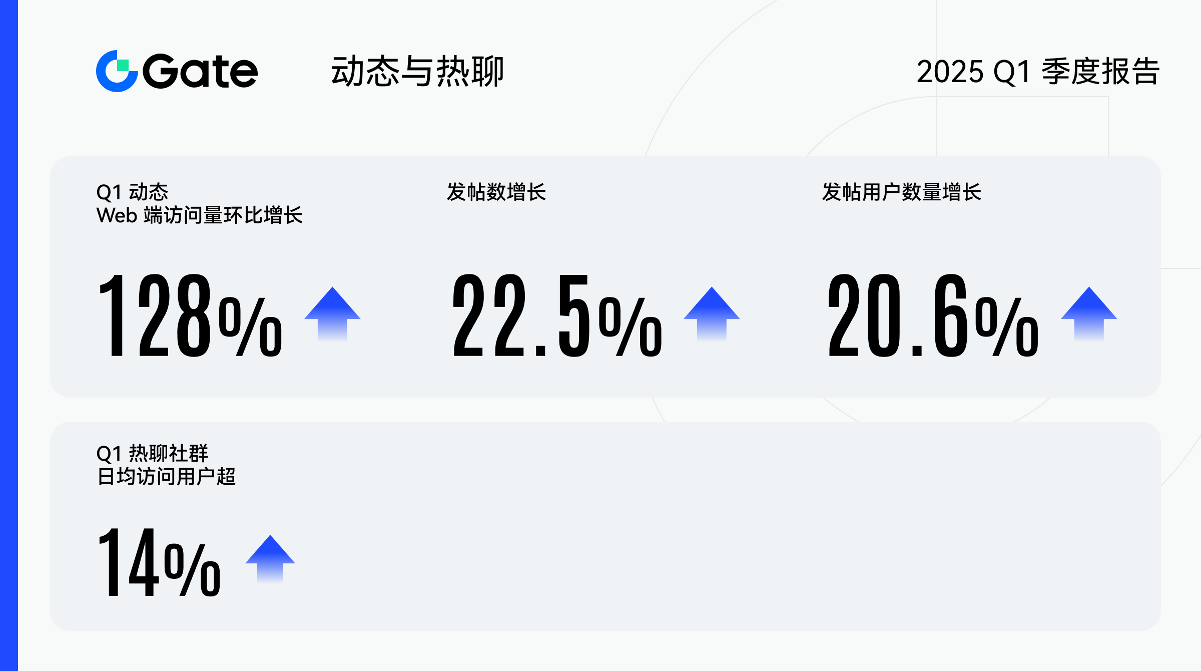 2025 年第一季度,Gate 动态和热聊社群的用户活跃度显著提升。Gate 动态作为站内重要的社交媒体平台,汇聚了行业资讯、交易分析和专家观点,吸引了大量用户参与互动。本季度,Web 端访问量环比增长 128%,发帖数量增长 22.5%,发帖人数增长 20.6%。与此同时,热聊社群累计访问用户环比增长 14%,为用户提供了活跃的行情讨论与策略分享空间。