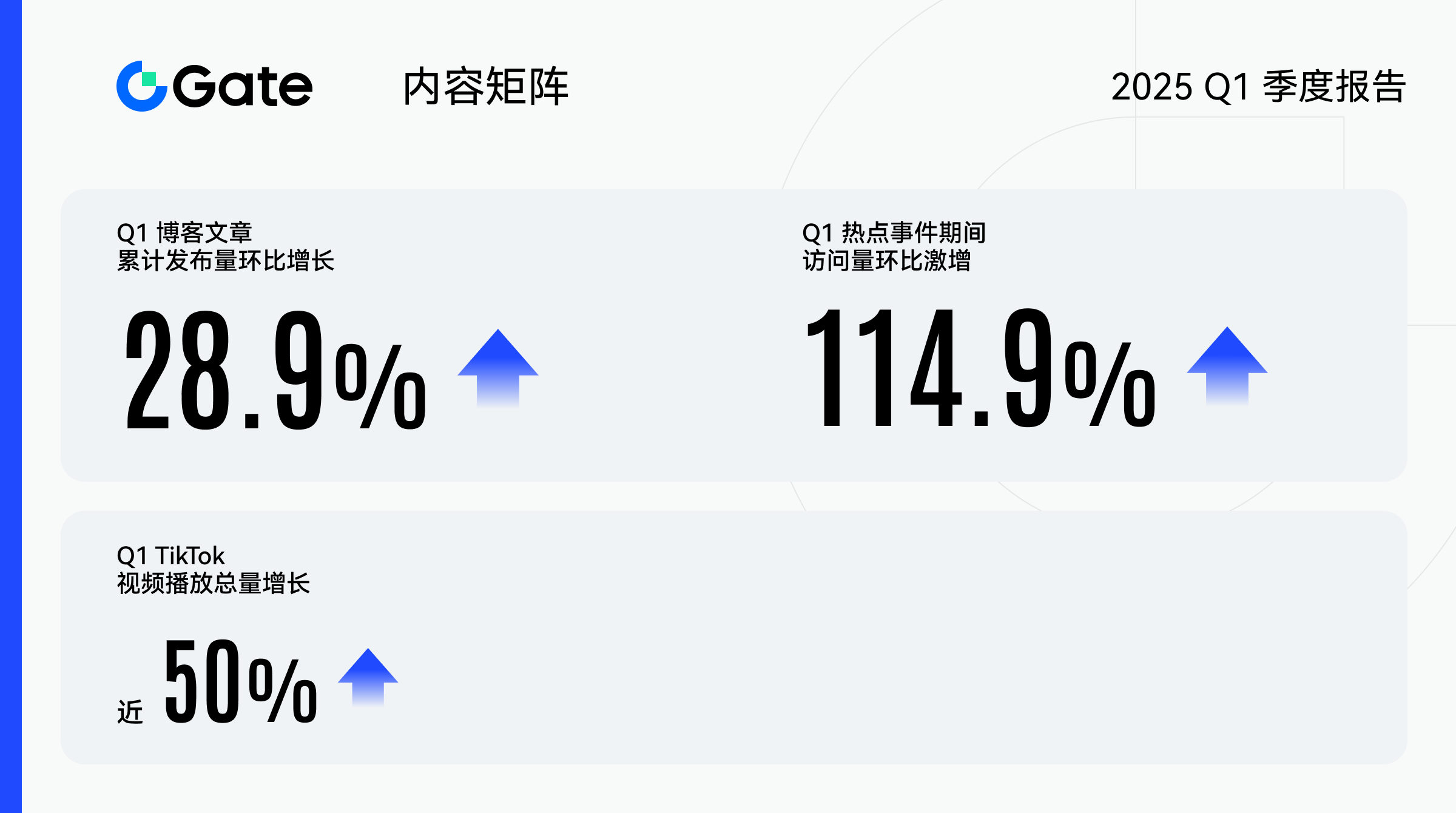 2025 年第一季度,Gate 内容生态建设成效显著,各平台运营数据实现全面突破。博客平台产出量质齐升,累计发布量环比增长 28.9%,内容覆盖每日市场快讯、深度行情解析、行业趋势研判等核心板块;热点事件期间访问量环比激增 114.9%。