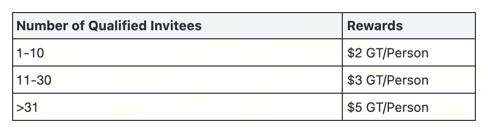 - 活动期间,每个邀请人最多邀请人数不设上限,邀请越多,GT奖励越多,GT总奖池$3,000,先到先得。