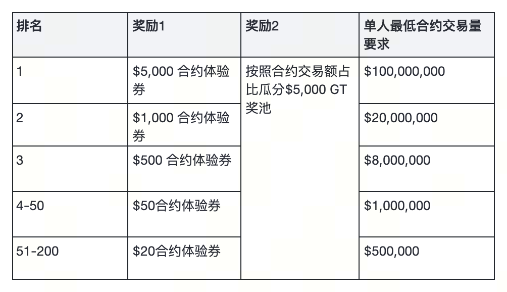 活动期间,被邀请人合约交易不低于$500,000,即有机会获得最高$5,000 合约体验券。被邀请人按照合约交易额占比瓜分$5,000 GT 奖池。