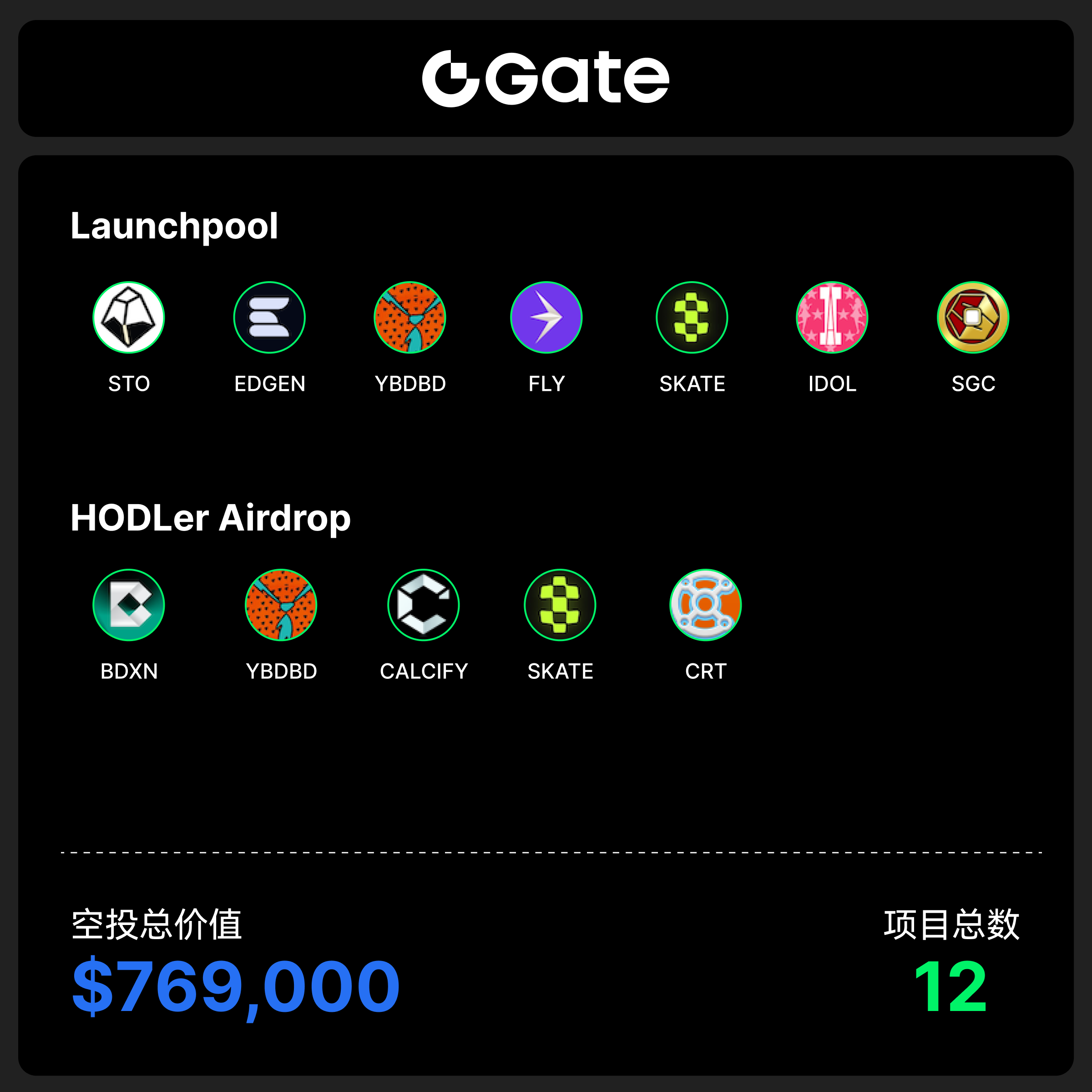 本周期 Gate 上线了13个新项目,5个HODLer Airdrop免费空投和7个 Gate Launchpool项目,总空投价值为$769,000。