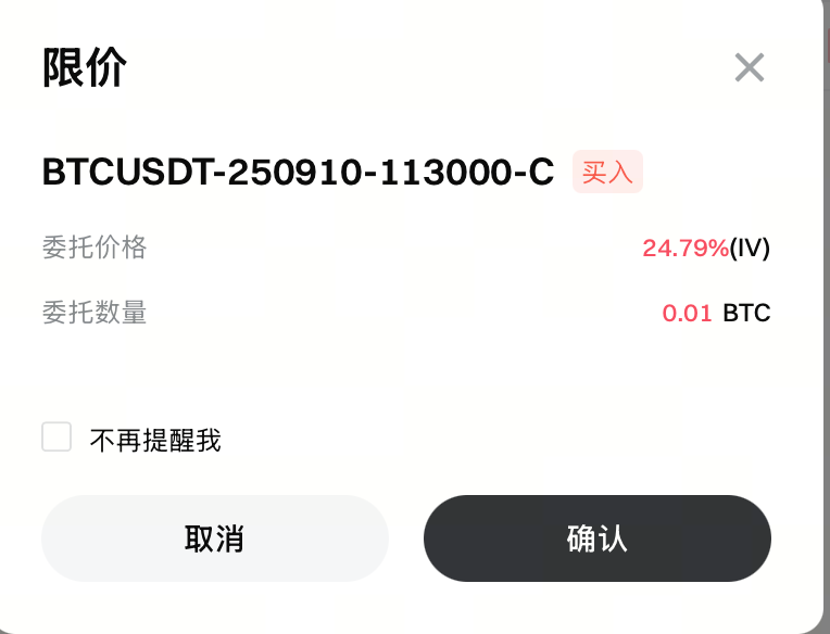 下单界面:二选一勾选框;选择Price或IV后,另一个选项处于置灰不可点击状态;