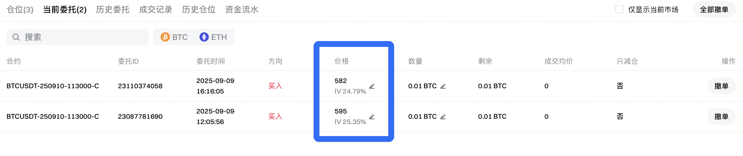 委托价格:展示用户下单填写的IV数值;如下图所示: