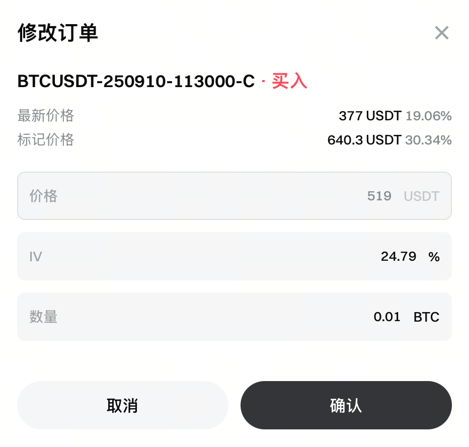 2. 改单弹窗中 Last price 字段展示对应IV、Mark price;点击 IV 字段后带入对应 IV 至改单弹窗的IV输入框内;参照下图可更改 IV 值。