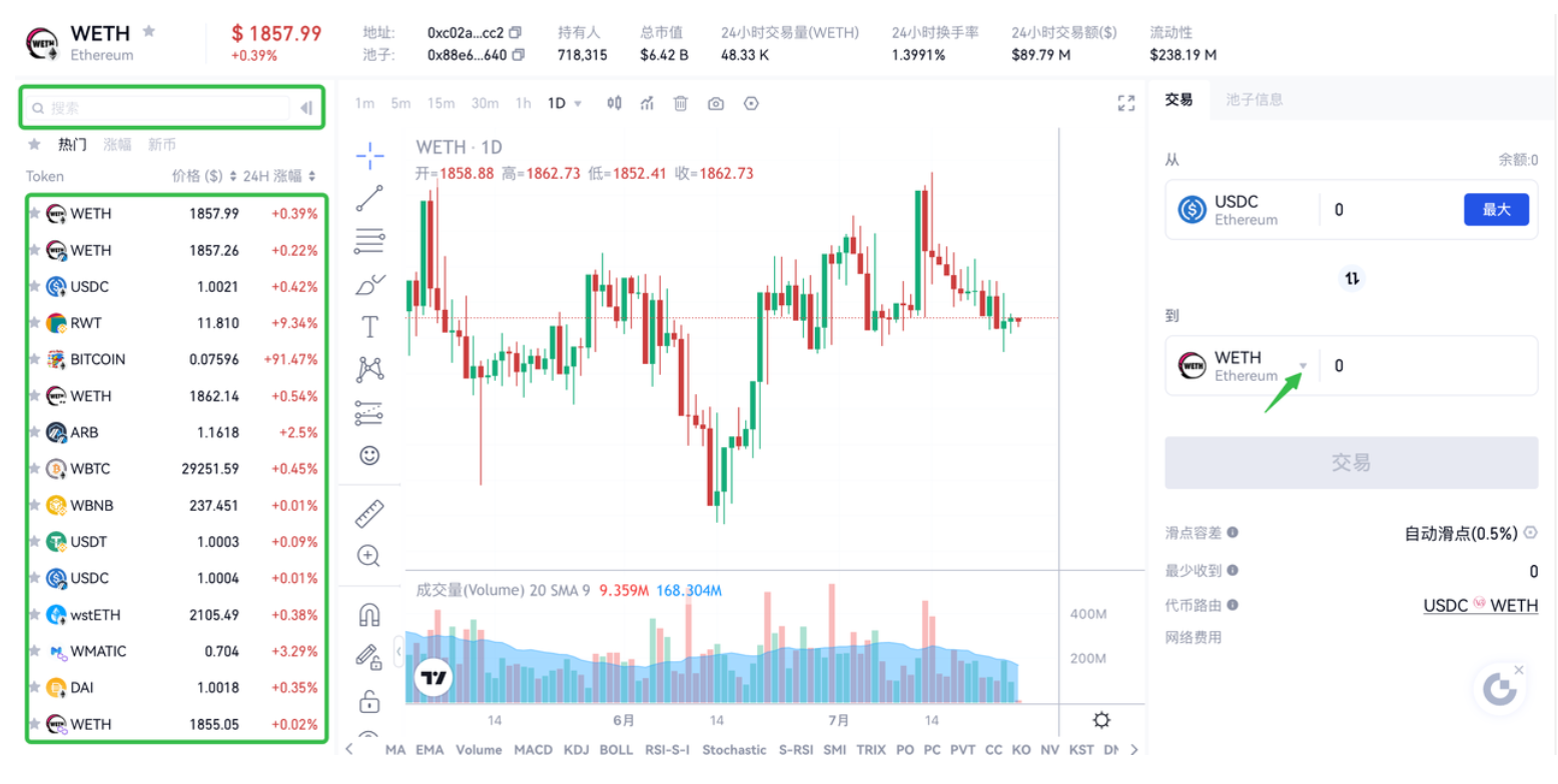 您可通过页面左侧的搜索栏搜索代币,或者直接在展示栏中选择代币,也可通过点击页面右侧的交易栏的“▽”选择代币。