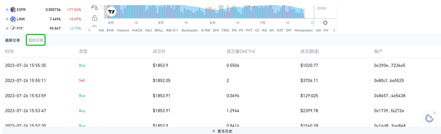 下拉“交易页面”,您可查看实时最新交易信息。点击“我的交易”,可查看您过往的交易历史以及持仓情况。