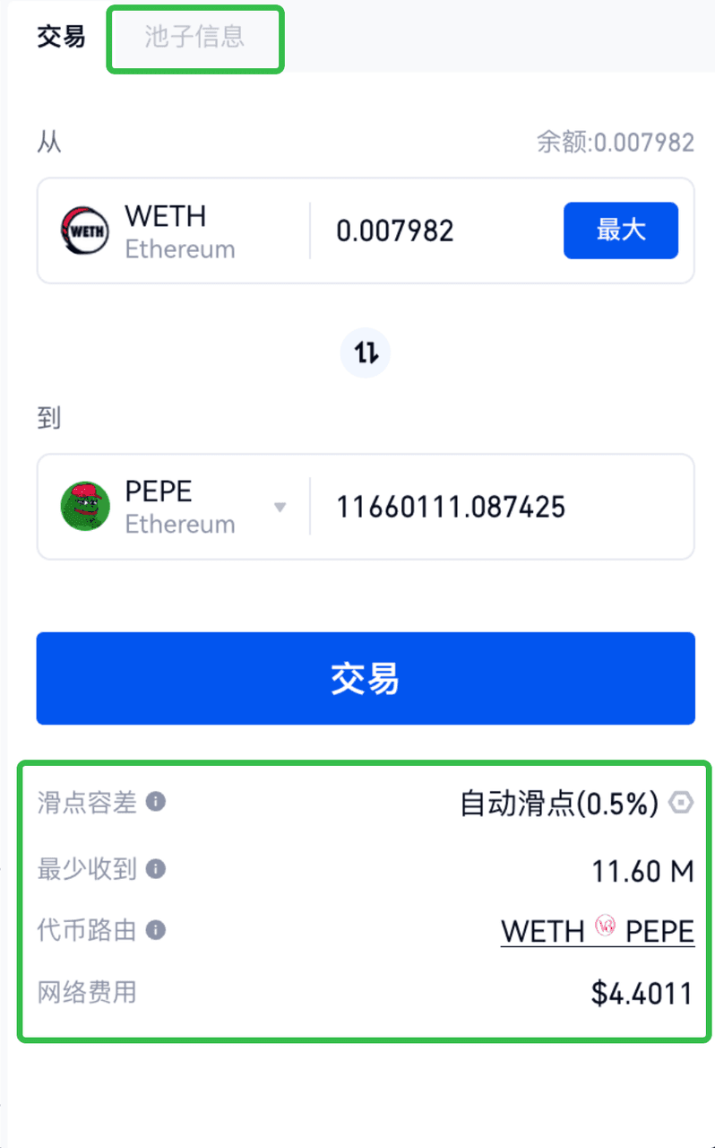点击交易栏中的“池子信息”,可查看支持您所选交易对的流动池中的深度、流动性等信息。交易栏下方可查看您所选交易对的滑点容差(点击“自动滑点0.5%”后边的符号可设置滑点)、本次交易最少能够收到的交易代币、Gate Web3为您本次规划的最佳交易路径以及本次交易的网络费用。