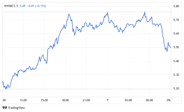 NWSBCT(蓝筹股指数): NWSBCT指数在清晨时段触及约5.76的阻力位。未能维持该水平后,指数迅速崩盘,穿过了次级支撑区。目前正测试接近5.50的关键支撑区域。技术结构显示对夜间高点的明显拒绝,指数必须在此区域建立更高的低点,才能维持其更广泛的反弹叙事。