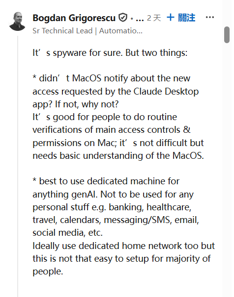 前苹果技术主管 Bogdan Grigorescu 也在 LinkedIn 上呼吁,使用者应在虚拟机或专用的独立设备上执行这类生成式 AI 工具,应尽量避免在处理个人财务与机密的主要电脑上安装。