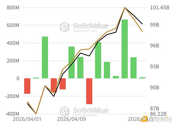 其中 4 月 17 日单日净流入高达 6.6391 亿美元,为近期最高;4 月 14 日和 4 月 20 日分别录得 4.115 亿和 2.3837 亿美元净流入;4 月 15 日贡献 1.86 亿。
