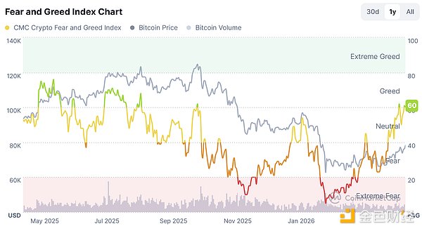 据 Coinglass 数据显示,过去 24 小时,全网未平仓合约爆仓数据 4.62 亿美元,空单爆仓 3.53 亿美元。据 CMC 最新数据显示,市场恐慌与贪婪指数回升至 60,情绪保持中性。