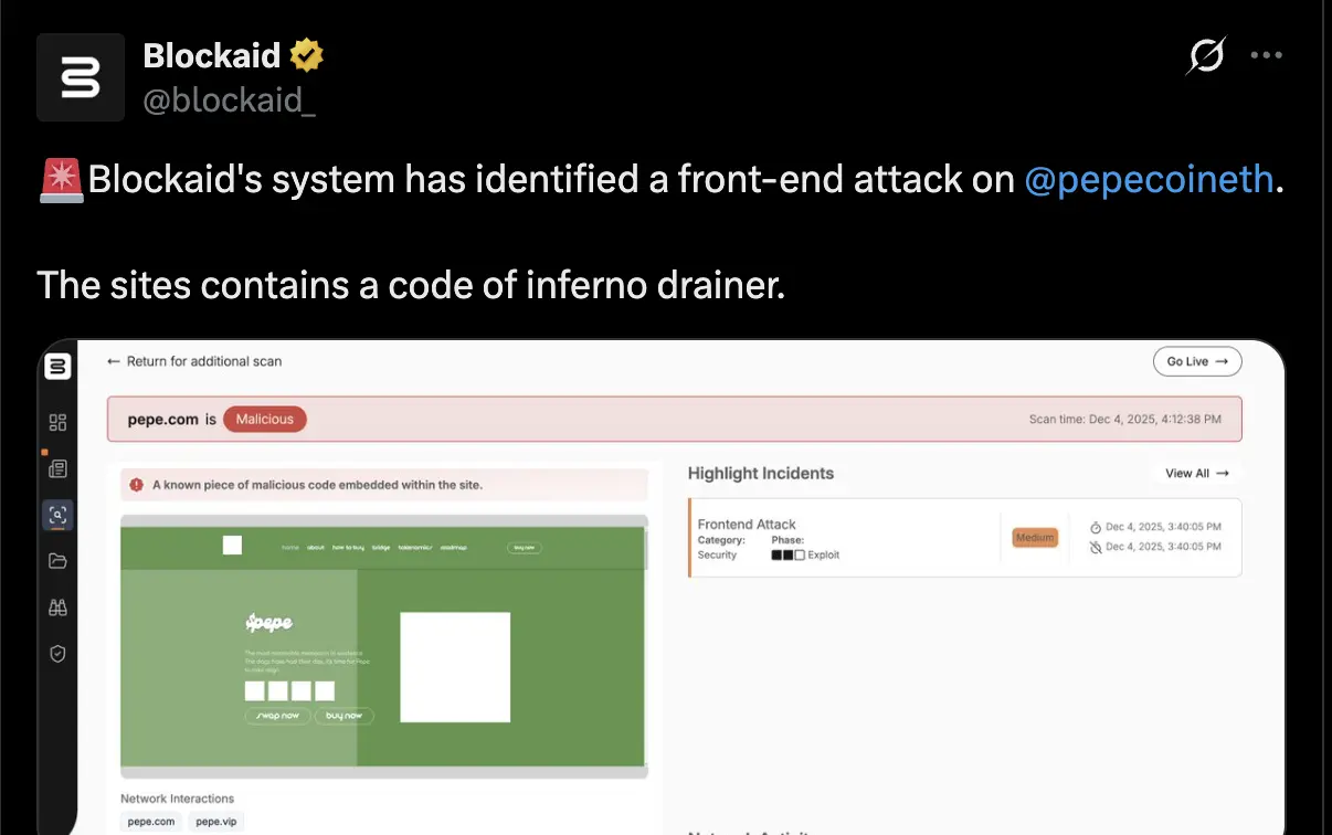 قالت شركة الأمن السيبراني يوم الخميس: “نظام Blockaid اكتشف هجومًا على الواجهة الأمامية لموقع Pepe. يحتوي الموقع على كود inferno drainer”.