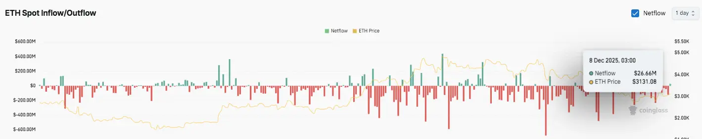 تظهر تدفقات السوق الفورية قصة مختلفة. سيطرت تدفقات الخروج الحمراء من أغسطس إلى نوفمبر وأشارت إلى توزيع قوي. ومع ذلك، بدأت تدفقات الدخول الأخيرة في الظهور. سجل ETH تدفق دخول بقيمة 26.66 مليون دولار في 8 ديسمبر. هذا التحول يشير إلى أن بعض المشترين قد يعودون مع بقاء السعر فوق 3,100 دولار.