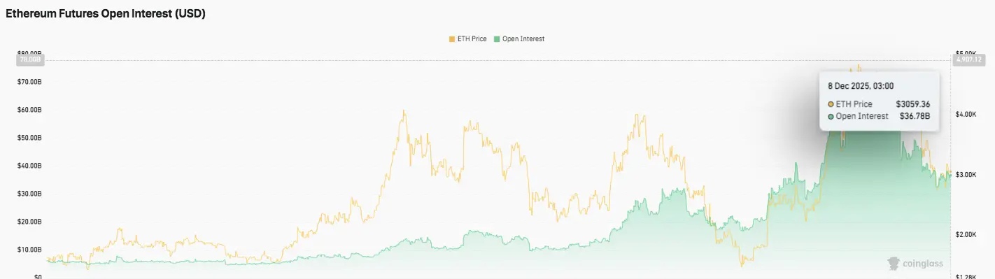 تُظهر عقود الإيثيريوم الآجلة المفتوحة زيادة في مشاركة المتداولين. فقد ارتفعت خلال النصف الثاني من العام وبلغت حوالي 36.7 مليار دولار في 8 ديسمبر. جاء هذا الارتفاع مع تعافي السعر، مما يشير إلى أن المتداولين زادوا تعرضهم خلال الصعود. علاوة على ذلك، ظل حجم العقود المفتوحة ثابتًا أثناء التراجعات القصيرة، مما يدل على الثقة في وضع الإيثيريوم العام.