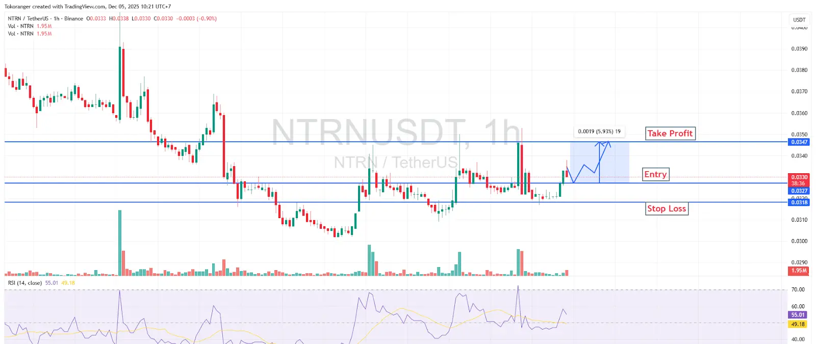 NTRN يحاول حالياً النهوض من مرحلة هدوئه ويتجه نحو منطقة المقاومة $0.0347، وهي الهدف الأقرب للارتفاع. يظهر نمط السعر مسار قيعان أعلى بشكل منتظم، ما يدل على أن المشترين بدأوا في السيطرة على الزخم، بينما يؤكد ارتفاع RSI من المنطقة المتوسطة أن الزخم الصاعد يزداد تدريجياً. طالما بقي السعر فوق منطقة الدخول $0.0327، يظل سيناريو الصعود صحياً.