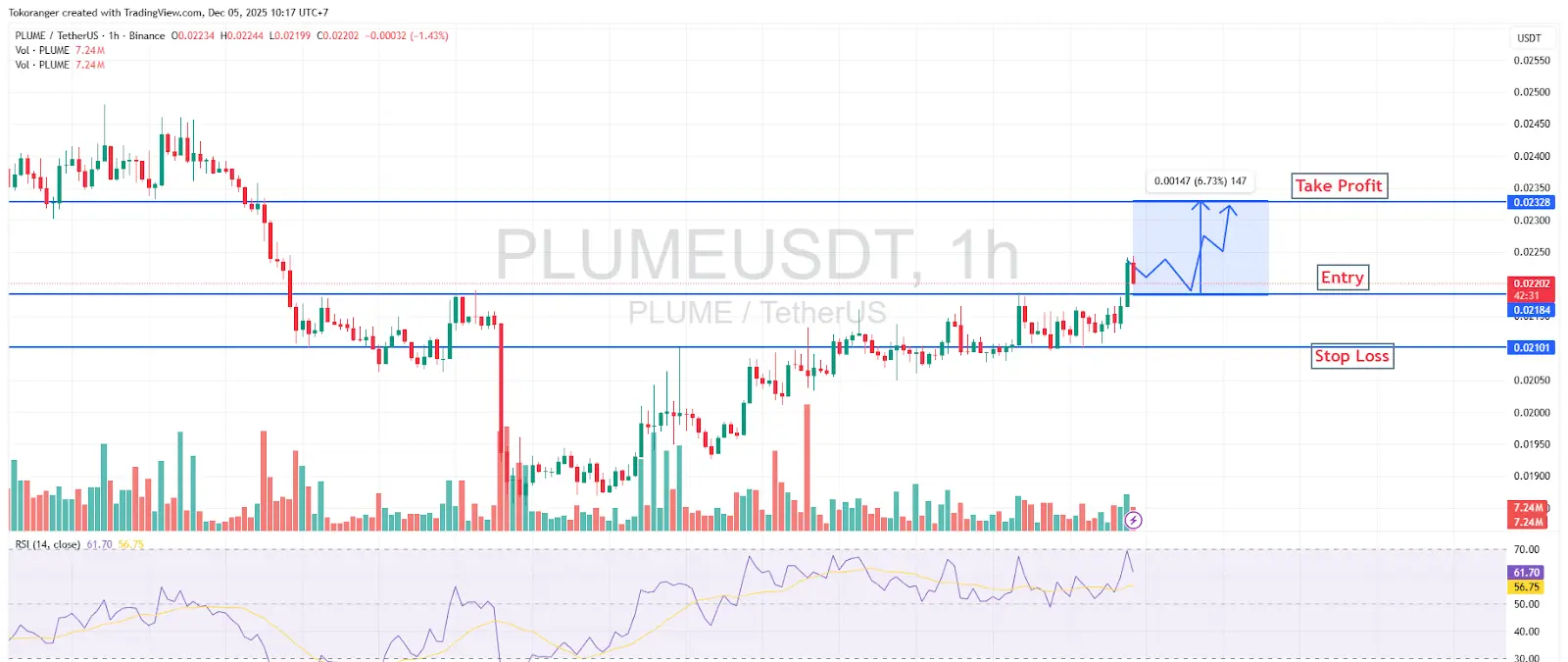 PLUME/USDT حالياً يشكل نمطاً يشير إلى أن المشترين بدأوا بالسيطرة بعد مرحلة تذبذب طويلة. السعر يحاول البقاء فوق منطقة الدخول $0.02184، وأي ارتداد من هذه المنطقة يدل على أن السوق يجمع الزخم قبل الدفع نحو المقاومة $0.02328. ارتداد مؤشر RSI من المستويات المتوسطة يظهر أن زخم الشراء لا يزال صحياً دون مؤشرات تشبع شراء مفرط.