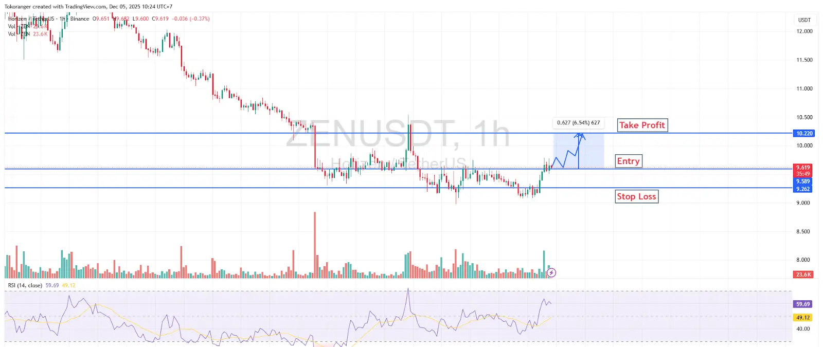 يظهر ZEN حالياً نمط تعافي صحي بعد تشكيل قاعدة في منطقة الدعم $9.26، ثم ارتد مع زيادة في حجم التداول، ما يدل على عودة المشترين للسيطرة. طالما بقي السعر فوق مستوى الدخول $9.58، تبقى الفرصة متاحة للارتفاع نحو منطقة جني الأرباح $10.22 لأن هيكل السعر بدأ يشكل قيعان أعلى بشكل منتظم، مما يشير إلى أن الزخم الصاعد بدأ يستقر. صعود RSI دون دخول منطقة التشبع الشرائي يعطي إشارة بأن هناك مجالاً إضافياً للارتفاع.