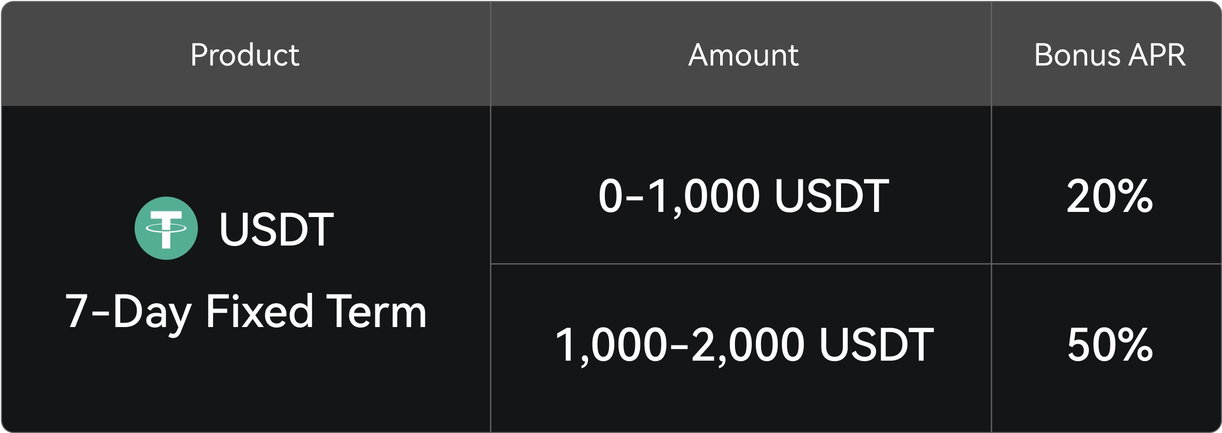 Pengguna yang belum pernah menggunakan Simple Earn sebelumnya dapat membuka hadiah bertingkat berdasarkan total jumlah berlangganan mereka untuk produk USDT Fixed Term 7-hari selama acara — dengan APR Bonus maksimum sebesar 50%.