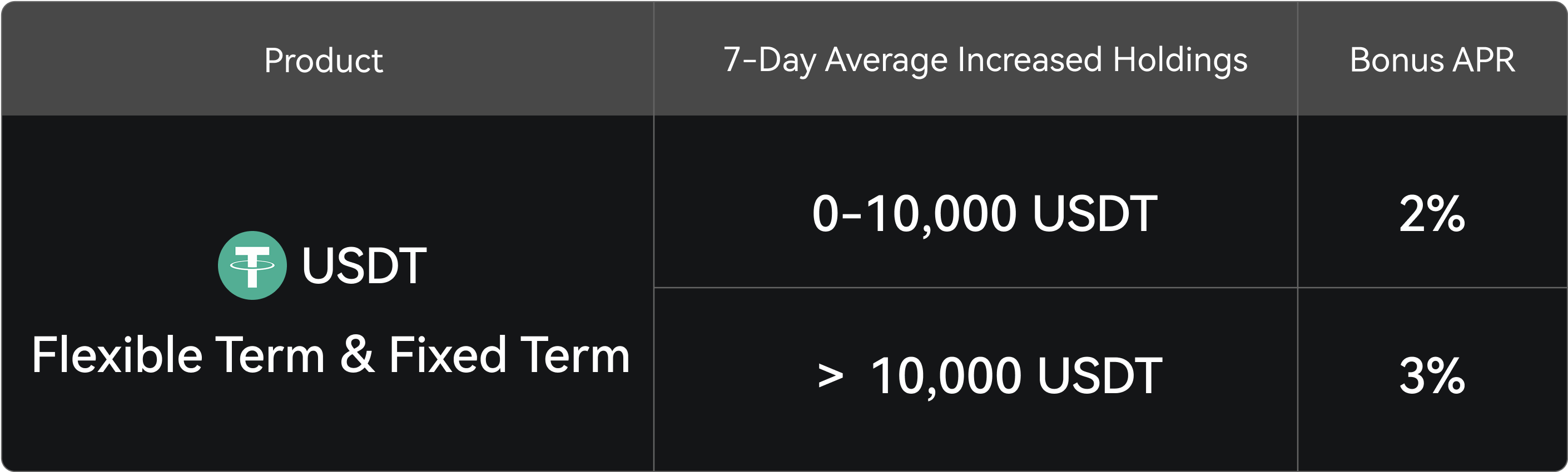 Setelah mendaftar untuk acara tersebut, pengguna dapat menikmati APR bonus bertingkat berdasarkan peningkatan bersih rata-rata dalam kepemilikan USDT mereka (baik Jangka Fleksibel maupun Jangka Tetap) selama 7 hari setelah pendaftaran acara.
