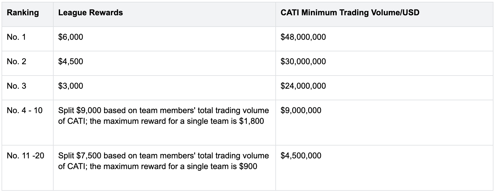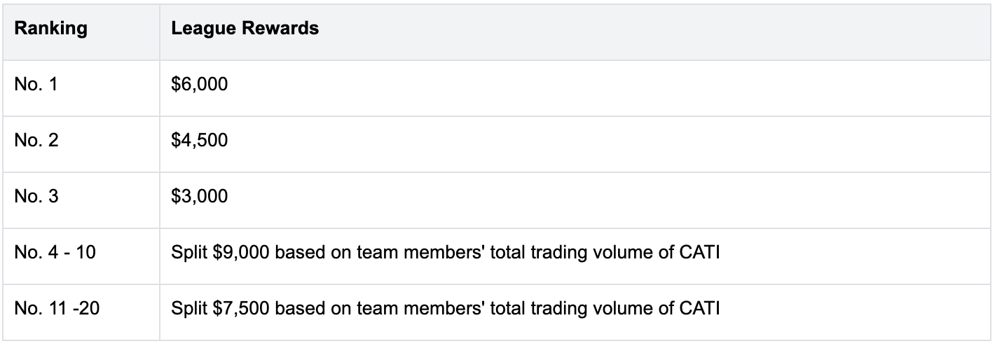Les équipes seront classées en fonction du volume total de trading CATI des membres de l'équipe (y compris le volume de trading PreToken et le volume de trading spot ; aucune limite au nombre de membres de l'équipe, même une seule personne peut former une équipe). Les participants se partageront les récompenses de la ligue en fonction du ratio de leur volume de trading dans CATI
