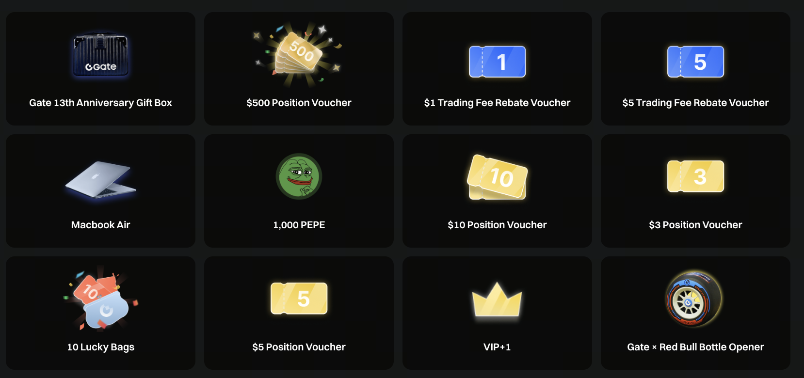 10. Les bons de position, tokens, sacs chanceux seront distribués dans un délai de 30 jours ouvrés après la fin de l’événement. Les récompenses merch seront distribuées dans les 60 jours suivant la fin de l’événement. Après vérification, les récompenses seront envoyées. Veuillez surveiller vos informations logistiques. En cas d’échec de livraison lié à la logistique, la marchandise sera remplacée par un bon de position équivalent (Macbook Air M5 sera remplacé par un bon de position de 10 000 $, le coffret cadeau du 13e anniversaire Gate par un bon de position de 500 $, l’ouvre-bouteille Gate X RedBull par un bon de position de 200 $).
