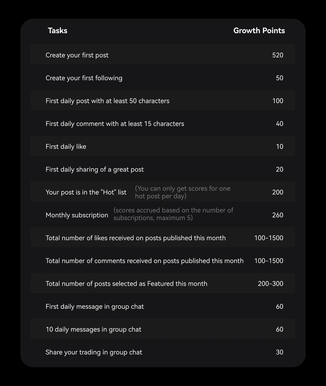 Complétez des tâches telles que publier, commenter, liker et interagir pour gagner des Points de Croissance correspondants.