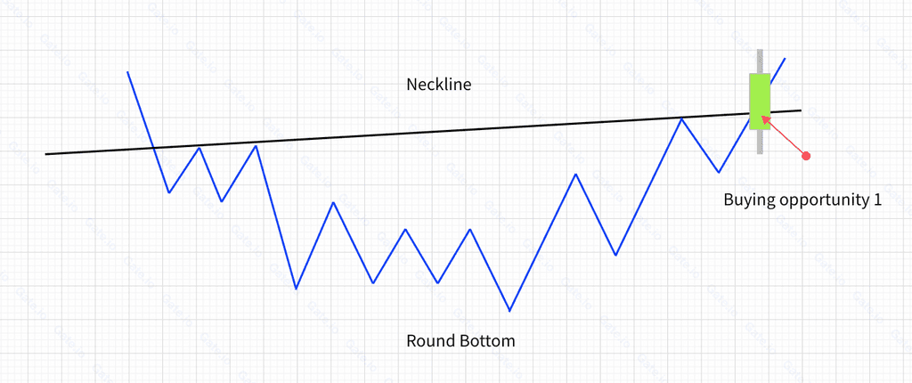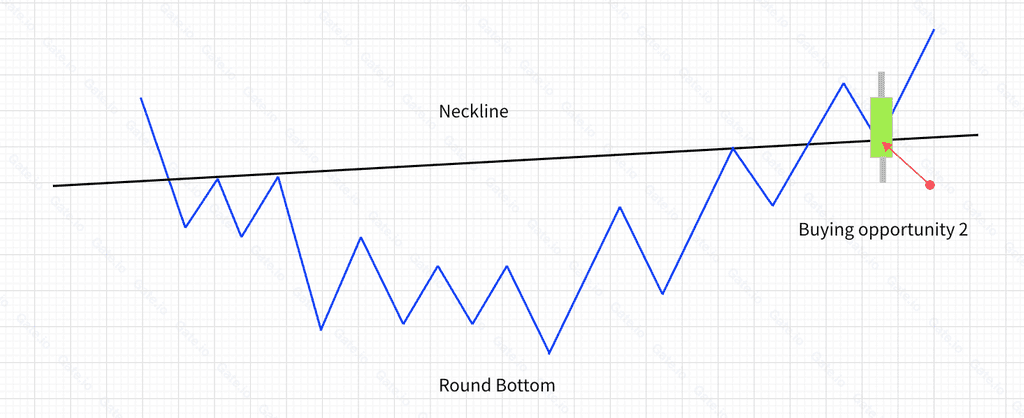 ①.A round bottom is a reliable pattern for a reversal signal. Traders can enter the market to open long positions when the price breaks up the neckline. Or, before the round bottom has yet been established, they can depend on other technical analysis methods to find the timing to enter.