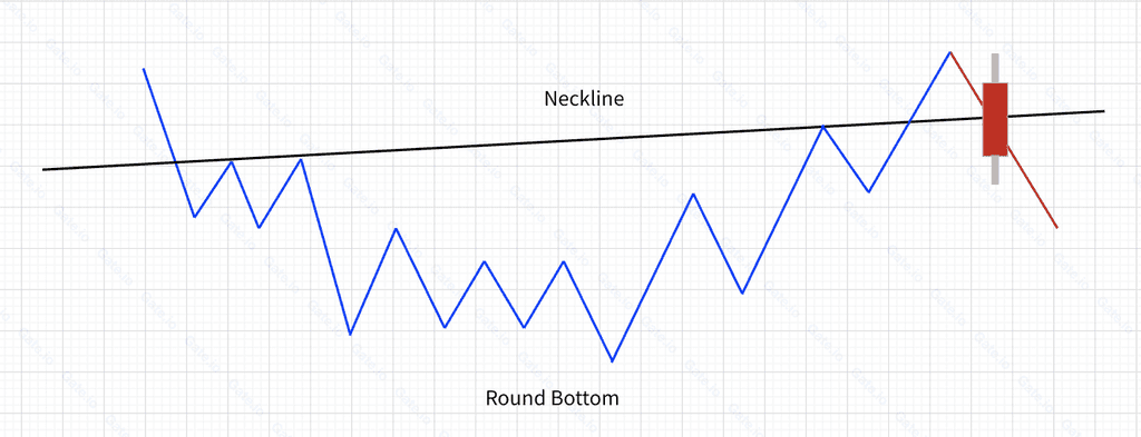 As illustrated above, the round bottom may not always function as an effective trading signal. Even though a perfect arc shape forms, trading volume doesn't see a significant rise as the price attempts to breach the neckline. Furthermore, after breaking it, the price drops below the neckline once again.