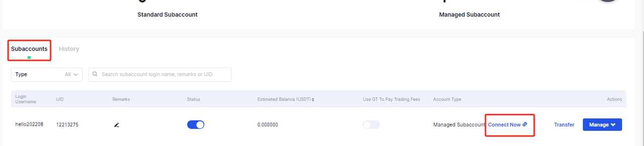 1.Setelah sub-akun terkelola berhasil dibuat,pengguna dapat menemukannya di “Sub-akun” dan klik “Hubungkan sekarang” untuk menghubungkannya ke tim perdagangan。