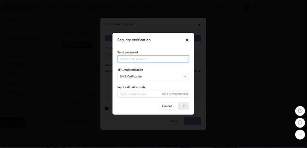 Kemudian,diperlukan Autentikasi 2FA。Pengguna dapat memilih Autentikasi Google atau Verifikasi SMS。Setelah memasukkan kode validasi,klik “OK”,dan subakun terkelola berhasil dibuat。