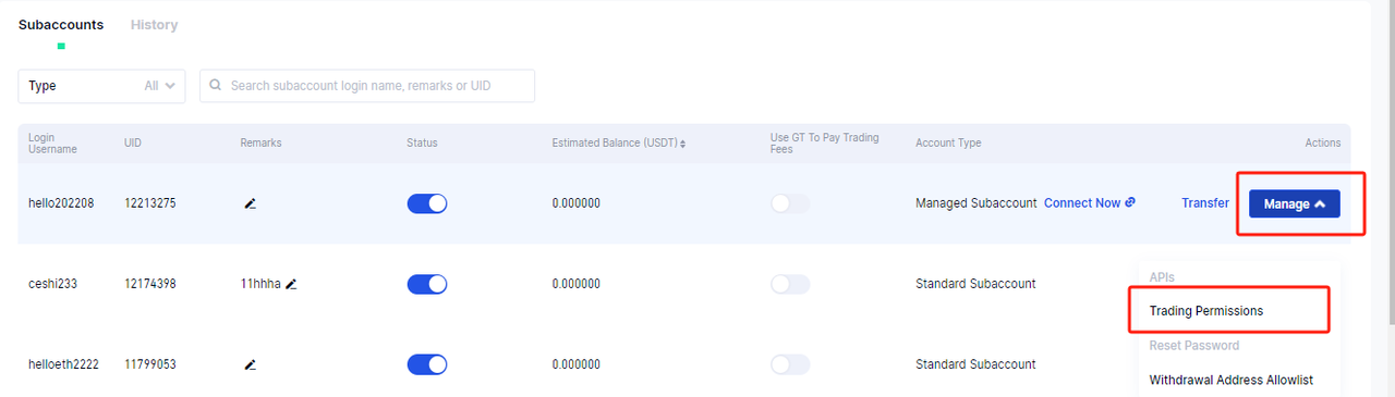 1.Di Sub-akun,pengguna dapat mengklik “Kelola”-“Izin Perdagangan” untuk mengkonfigurasi pengaturan perdagangan sub-akun,yang akan berlaku segera setelah lulus verifikasi keamanan。