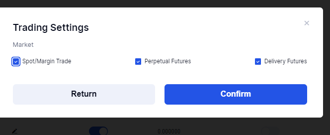 Atur "Pengaturan Izin Trading": Pilih Pasar yang Diizinkan: Perdagangan Spot/Margin, Kontrak Berjangka, Kontrak Berjangka Penyerahan (semua dipilih secara default);