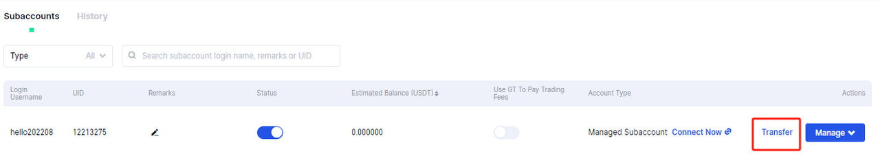 5.Di Sub-akun,pengguna dapat mengklik “Kelola”-“Transfer” untuk mentransfer dana di sub-akun yang dikelola secara bebas。