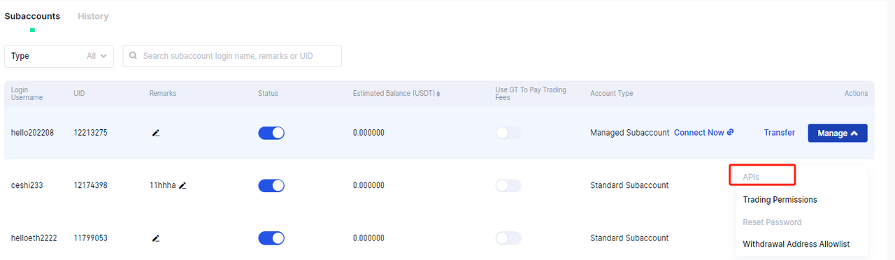 3.Manajer tim perdagangan dapat melakukan operasi perdagangan dengan membuat Kunci API yang sesuai dengan sub-akun yang dikelola。