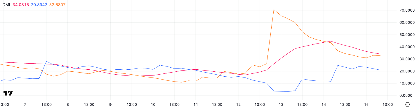 Indeks Arah Pergerakan (DMI) dari Pi Network menunjukkan bahwa indikator ADX – ukuran kekuatan tren – telah turun menjadi 34, dibandingkan dengan 44,59 hanya satu hari sebelumnya.