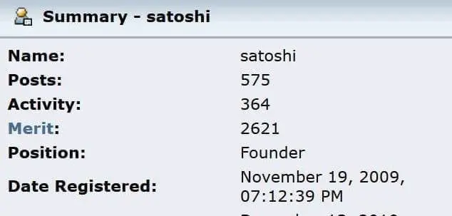 Aktivitas forum Satoshi berakhir dengan 575 posting, 364 poin aktivitas, dan gelar Founder, namun tidak ada pesan perpisahan atau pengumuman.