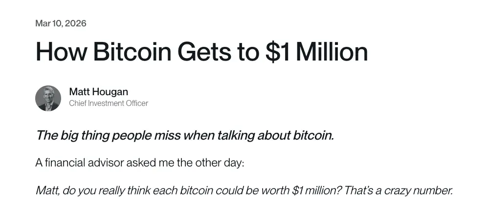 Chief Investment Officer Bitwise, Matt Hougan, pada 10 Maret 2026, merilis sebuah memo berjudul “How Bitcoin Gets to $1 Million”, yang secara sistematis menjelaskan analisisnya terhadap tren harga jangka panjang Bitcoin. Hougan berpendapat bahwa jika investor hanya fokus pada fluktuasi jangka pendek Bitcoin, mereka cenderung meremehkan potensi jangka panjangnya. Penilaian yang tepat harus menempatkan Bitcoin dalam kerangka kompetisi makro global untuk aset “penyimpanan nilai”. Ia secara tegas menyatakan bahwa mencapai 1 juta dolar AS bukanlah khayalan, melainkan hasil dari prediksi pertumbuhan total pasar penyimpanan nilai dan peningkatan pangsa pasar Bitcoin secara bersamaan.