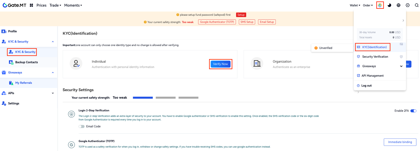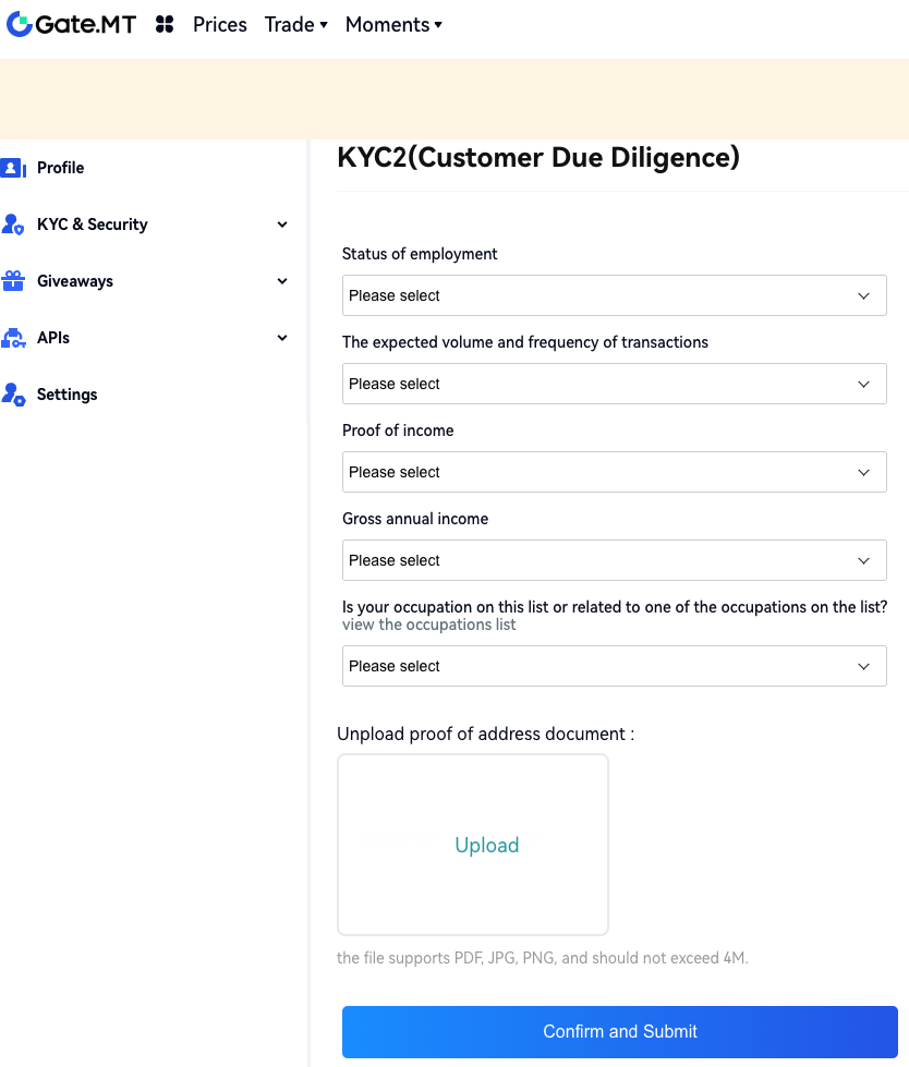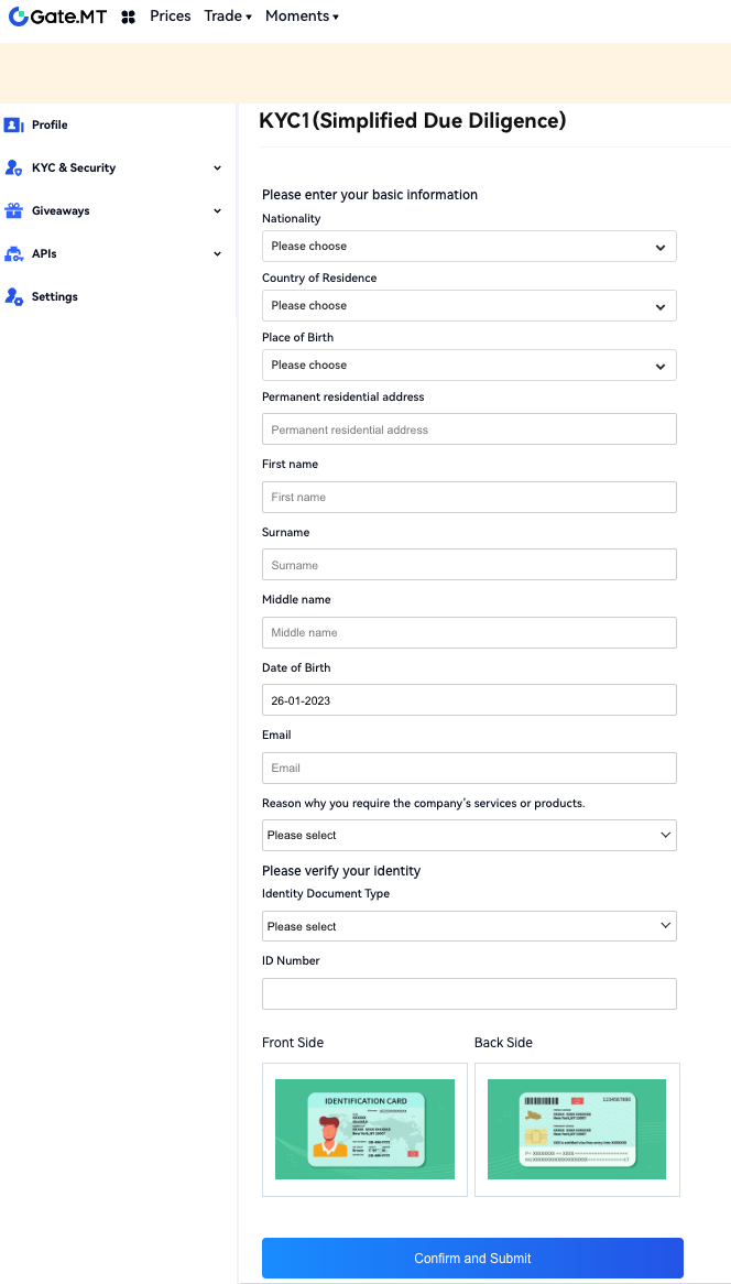 To ensure the safety of your assets, to guarantee favorable compliance for the development of cryptocurrency industry, and to reduce fraud, money laundering, blackmail, and other illegal activities, Gate.MT requires that all users pass KYC ID Verification. Only after completing KYC can users deposit and withdraw cryptocurrencies.