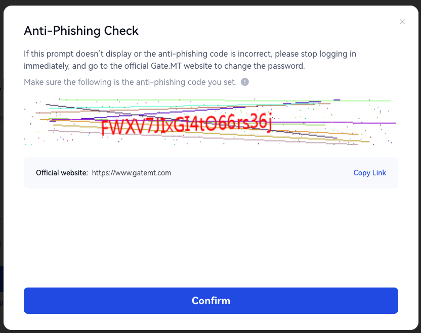 After logging in, an anti-phishing check window (as shown below) will pop up. Please check if the displayed anti-phishing code is the same as the one you set before. If you have not set an anti-phishing code, we recommend that you set one, which can be very easily done by following the instructions(Click "Security verification" - "Password Management" to set Anti-Phishing Code). If the displayed anti-phishing code is correct, then click "Confirm".