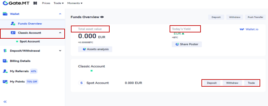 · You can check your assets in “Classic Account”. Shortcut actions like “Deposit”, “Withdraw” and “Trade” are also supported in the “Wallet”.
