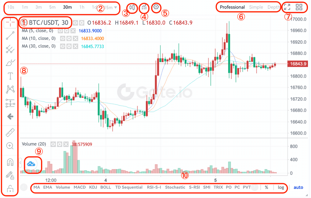 · Gate.MT provides users with three types of charts: the Professional chart, the Simple chart, and the Depth chart. The Professional and Simple candlestick charts provide an overview of market trends, while the Depth chart displays the volume of buy and sell orders on the order book. The Professional chart also offers additional functionality, such as drawing tools and technical indicators, to aid in analysis, and also allows for customizing time interval. The Simple chart also allows for customization of time interval.