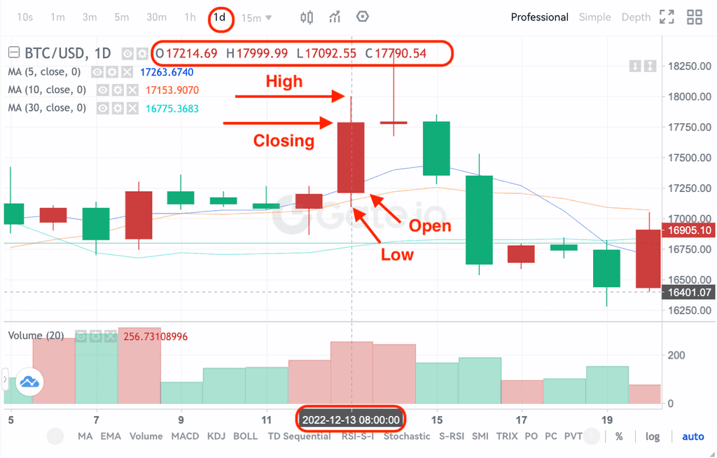 · Take the one-day candlestick chart of 2022-12-31 for example, in which red represents rise and green represents fall. The high, low, open, and closing prices are marked in the picture below. Moreover, the specific four prices are also listed on the right of the trading pair.