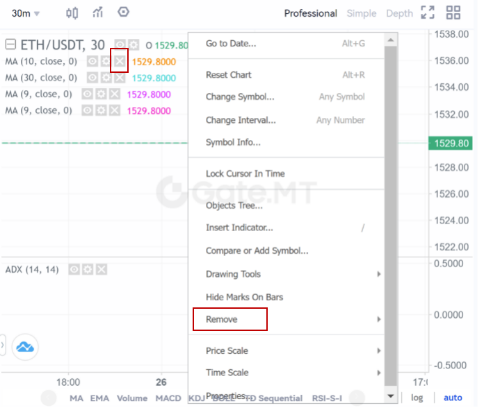 · If you want to remove the technical indicators displayed on the chart, you can right click on the chart and click “remove” to remove all indicators or drawing tools. Or you can simply click the “remove” icon. You can also reset the chart by clicking “Reset Chart”.