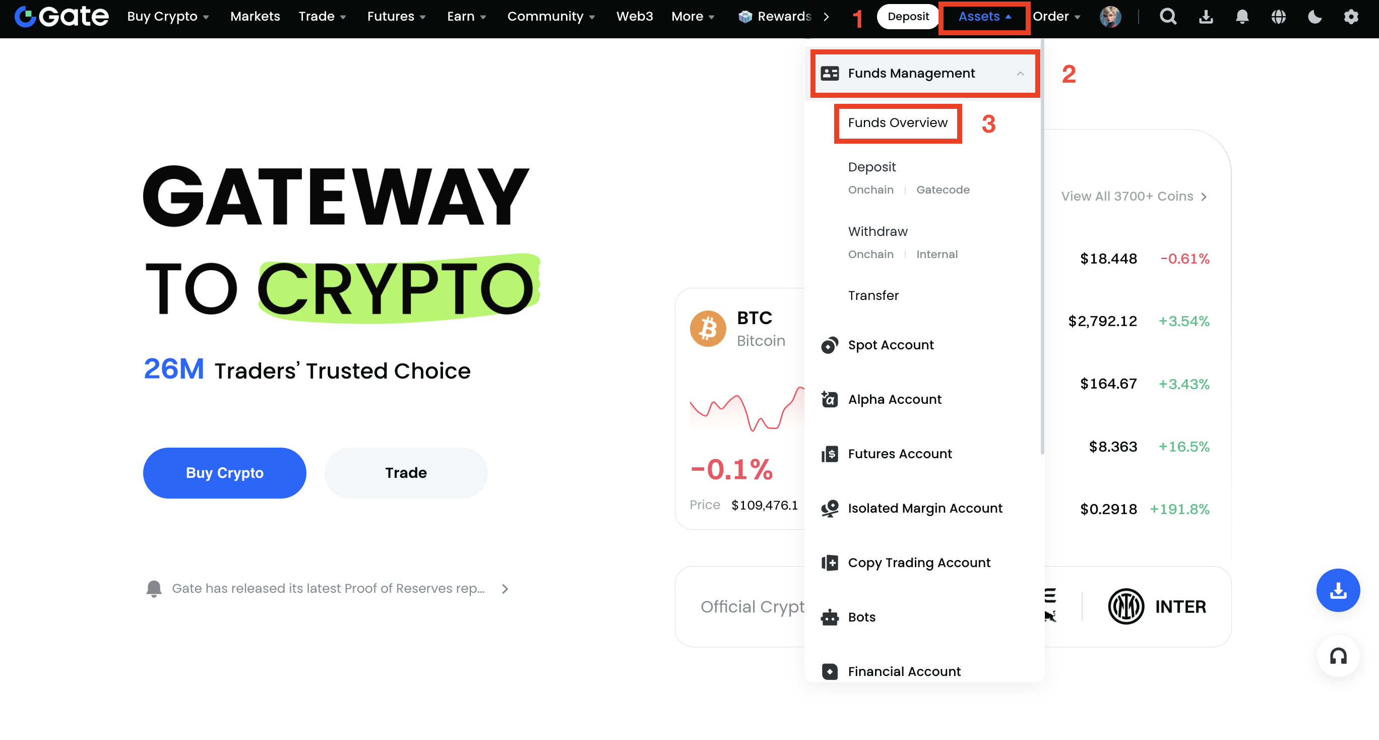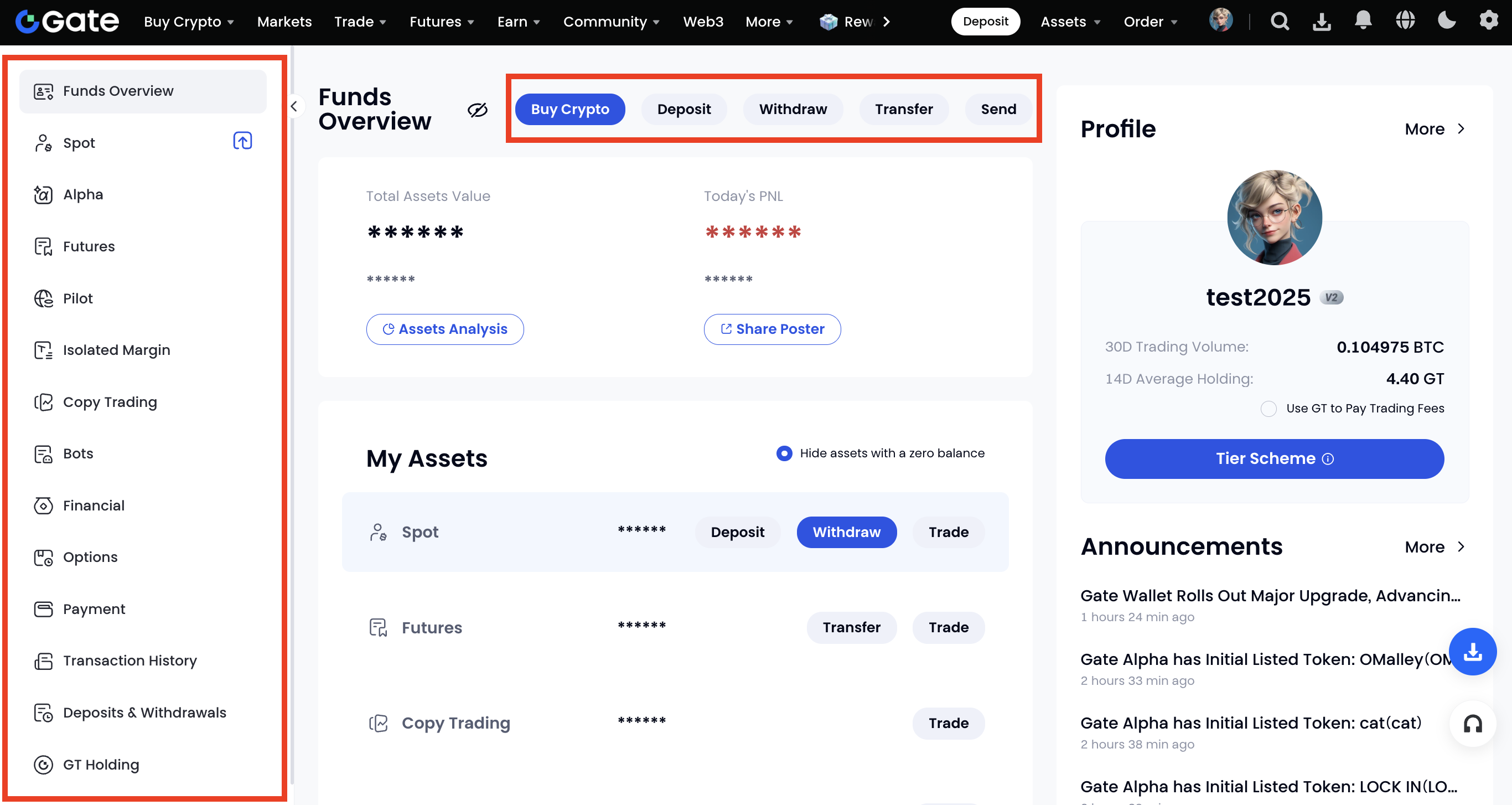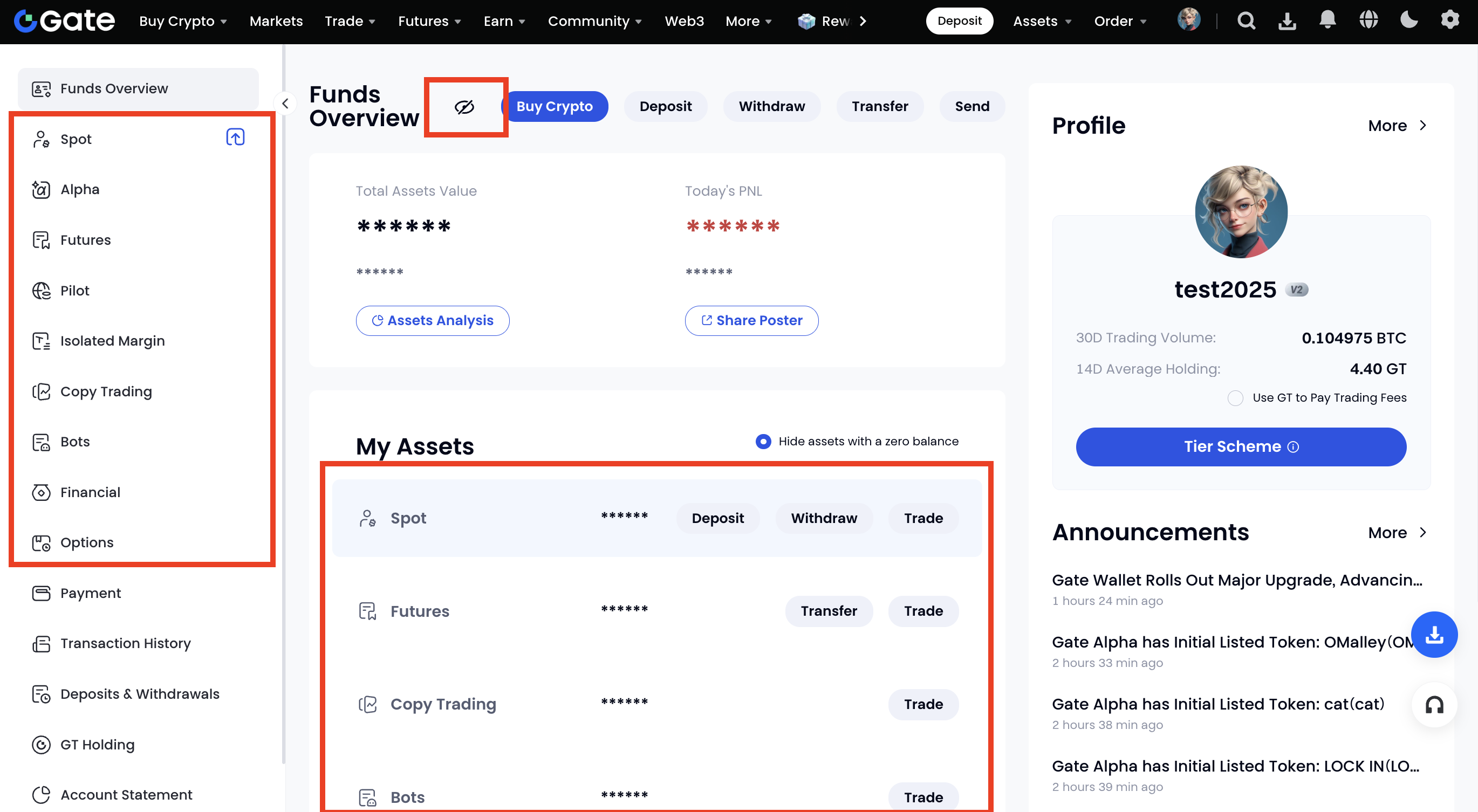 Gateアカウントにログインし、[資産] - [資金] - [資金概要]に移動します。