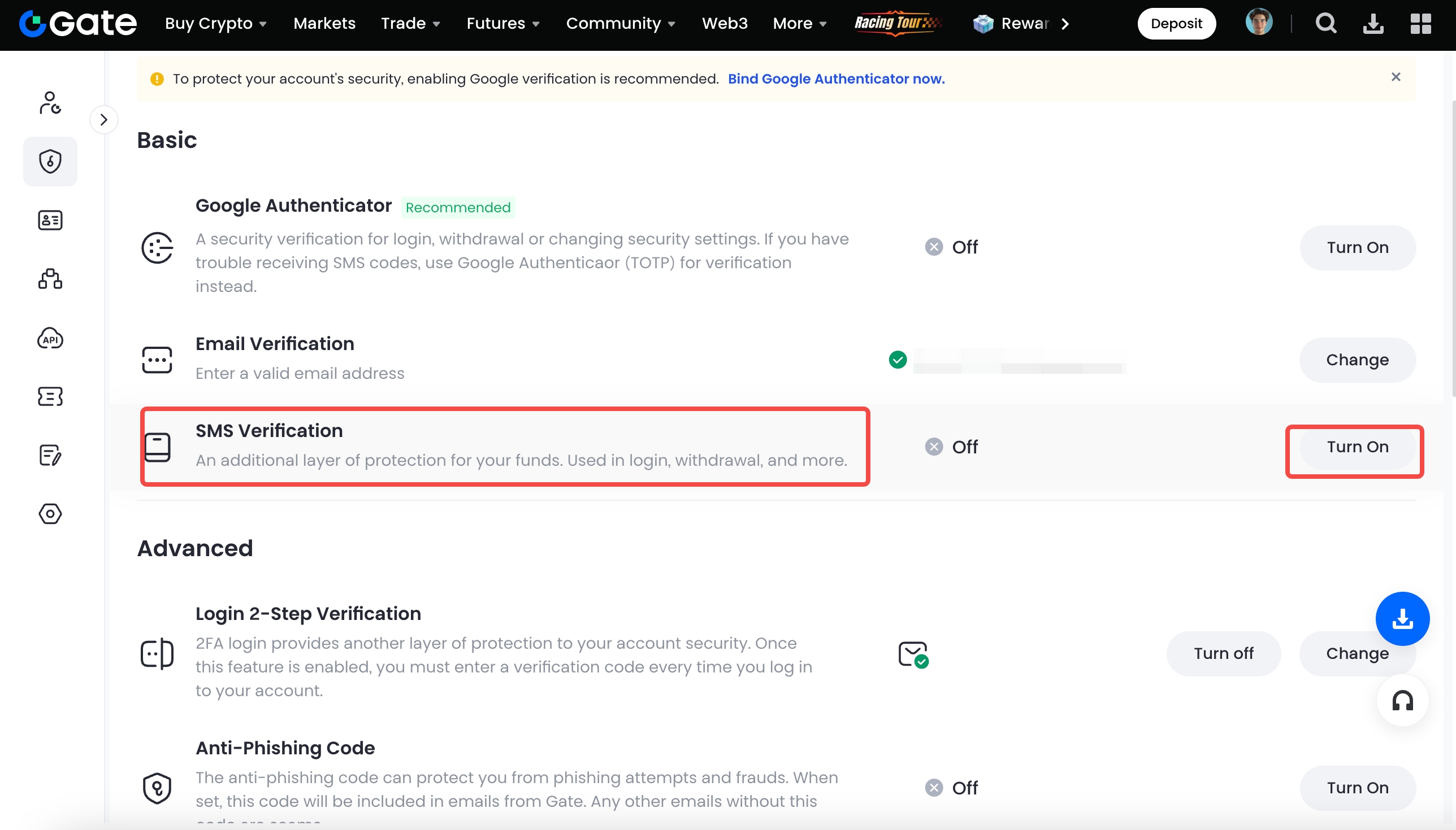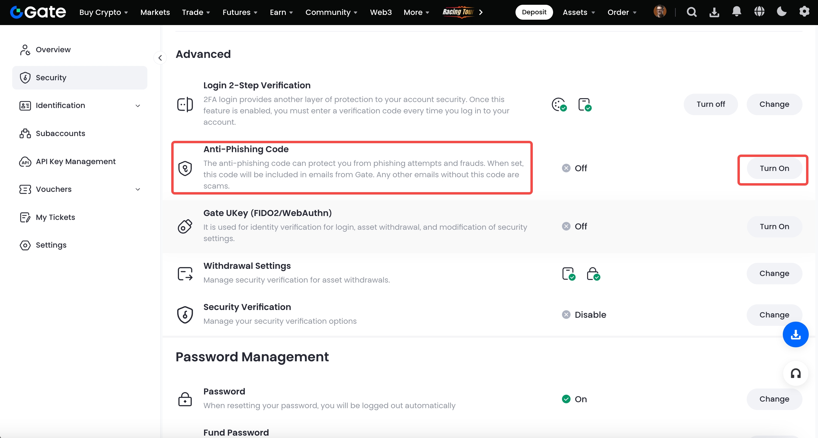 1.ログイン → アバターをクリック → セキュリティ認証 → パスワード管理 → フィッシング防止コード → 「オンにする」→「変更」→ 指示に従って操作を行います。