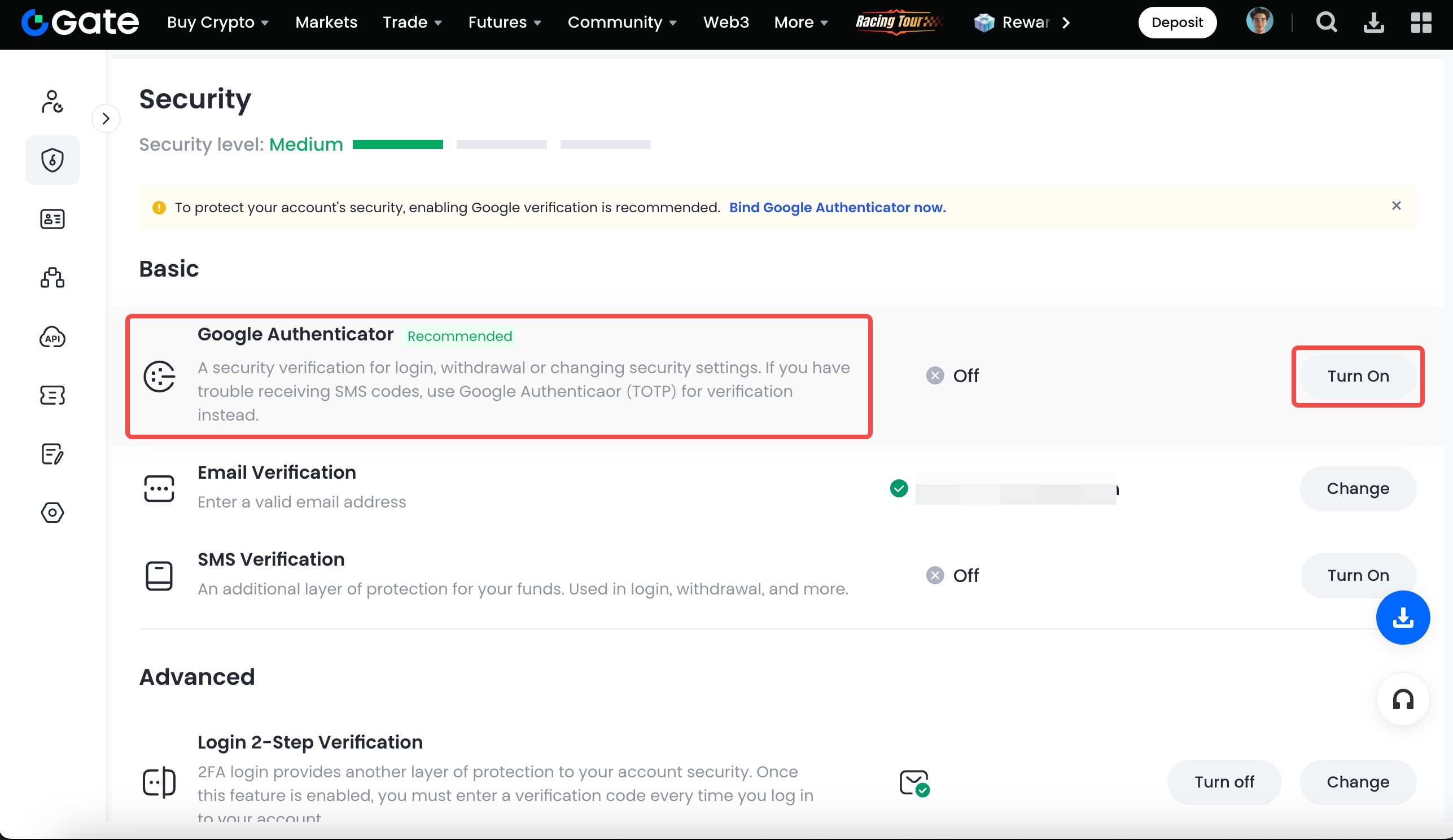 2段階ログインは、アカウントのセキュリティを強化するための追加の保護を提供します。この機能を使用するには、まずモバイル電話番号、Google Authenticator、またはメールアドレスをアカウントにリンクする必要があります。
