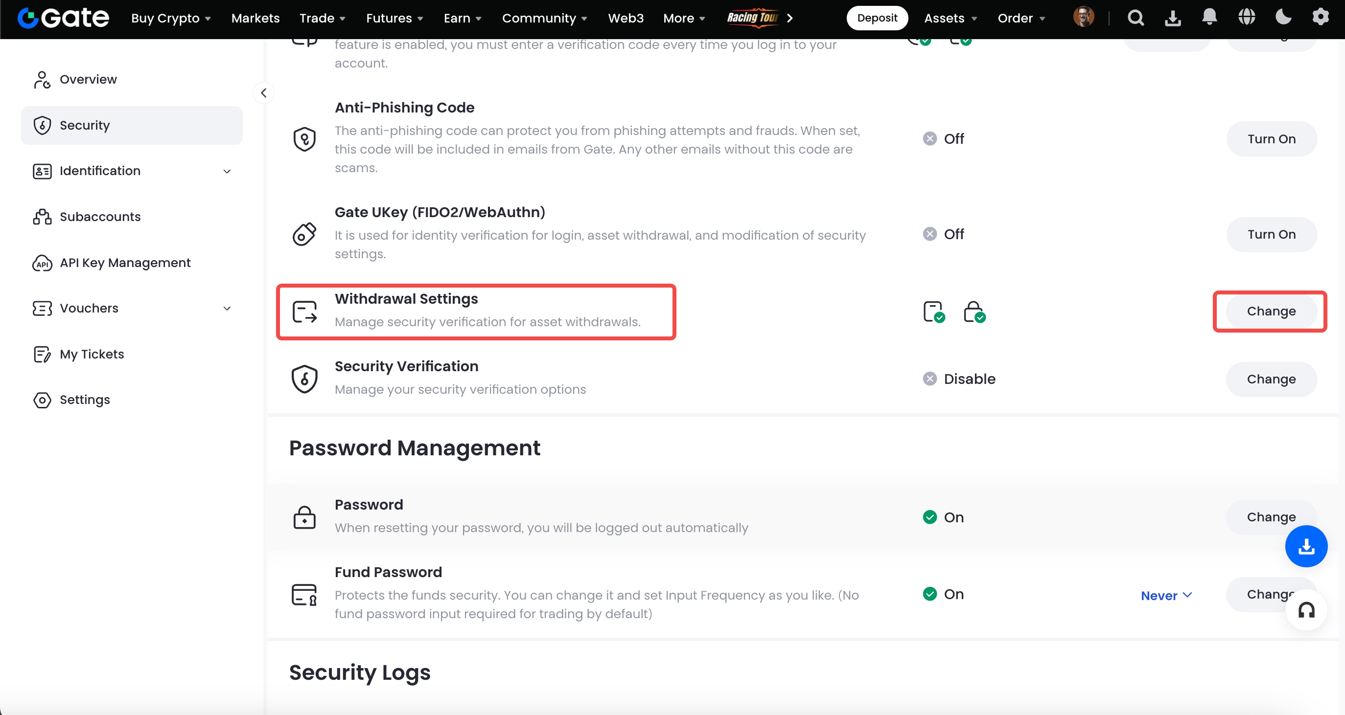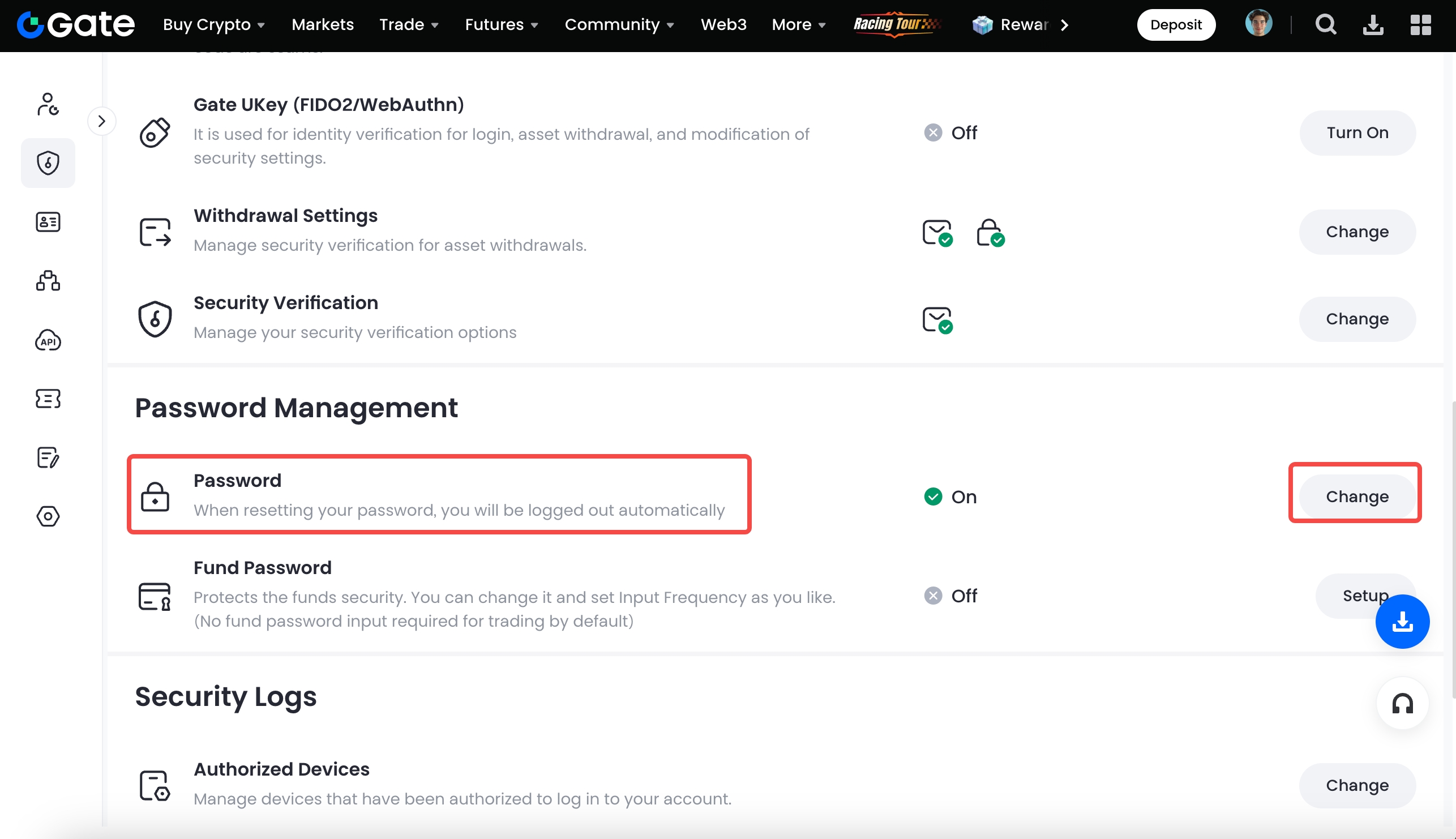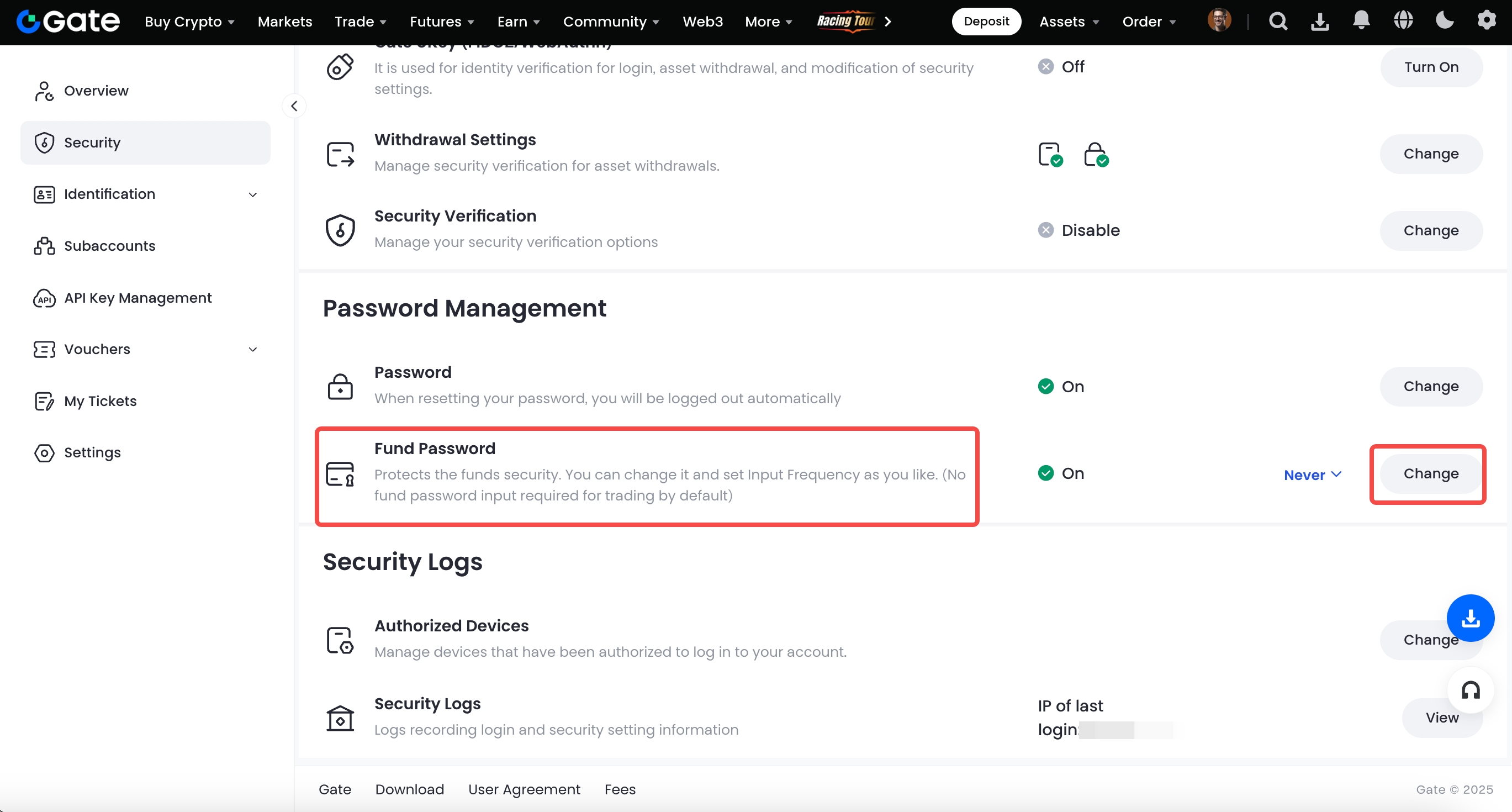 アカウントにログイン後、「セキュリティ設定」に進み、「パスワード管理」内の「資金パスワード」を見つけ、「変更」をクリックしてリセットします。