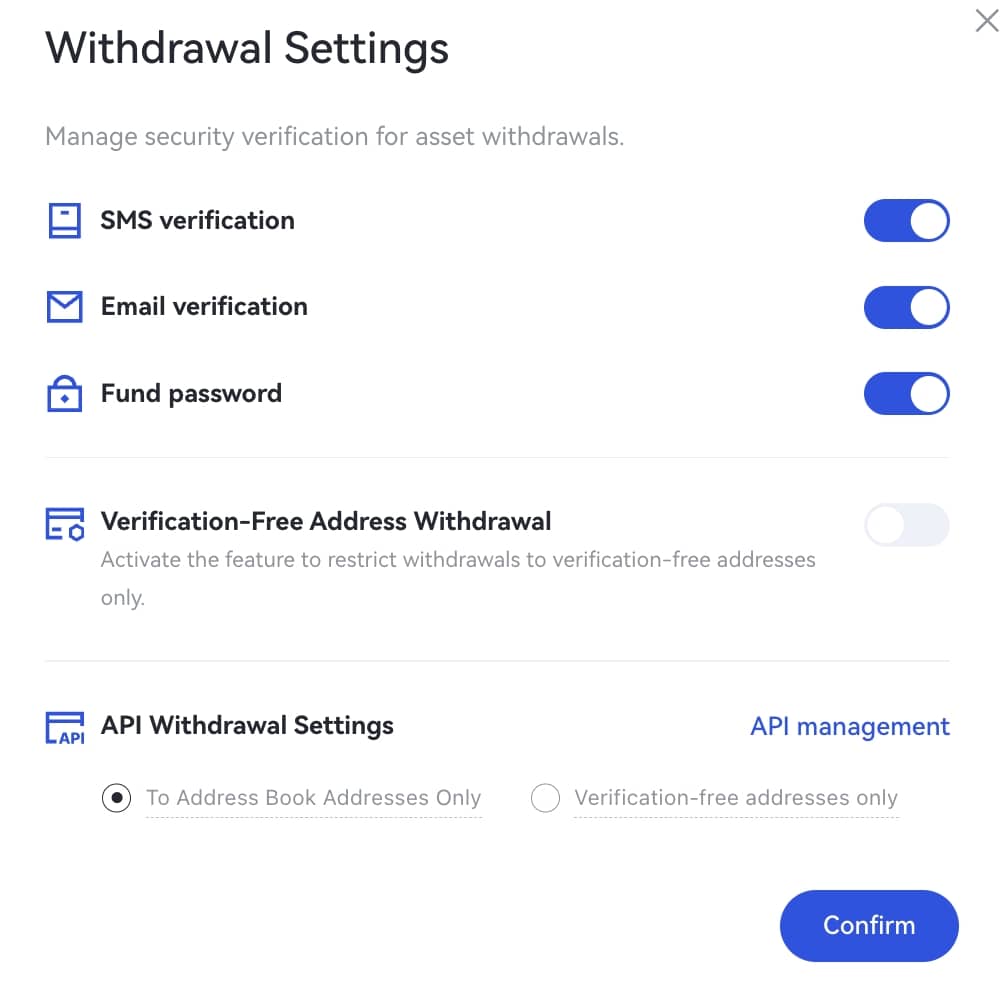ここから資産の出金に関する認証オプションを設定できます。選択肢は、SMS認証、メール認証、資金パスワード認証の3つです。これらのうち1つをオフにすることはできますが、セキュリティのため、少なくとも2つはオンにしておく必要があります。